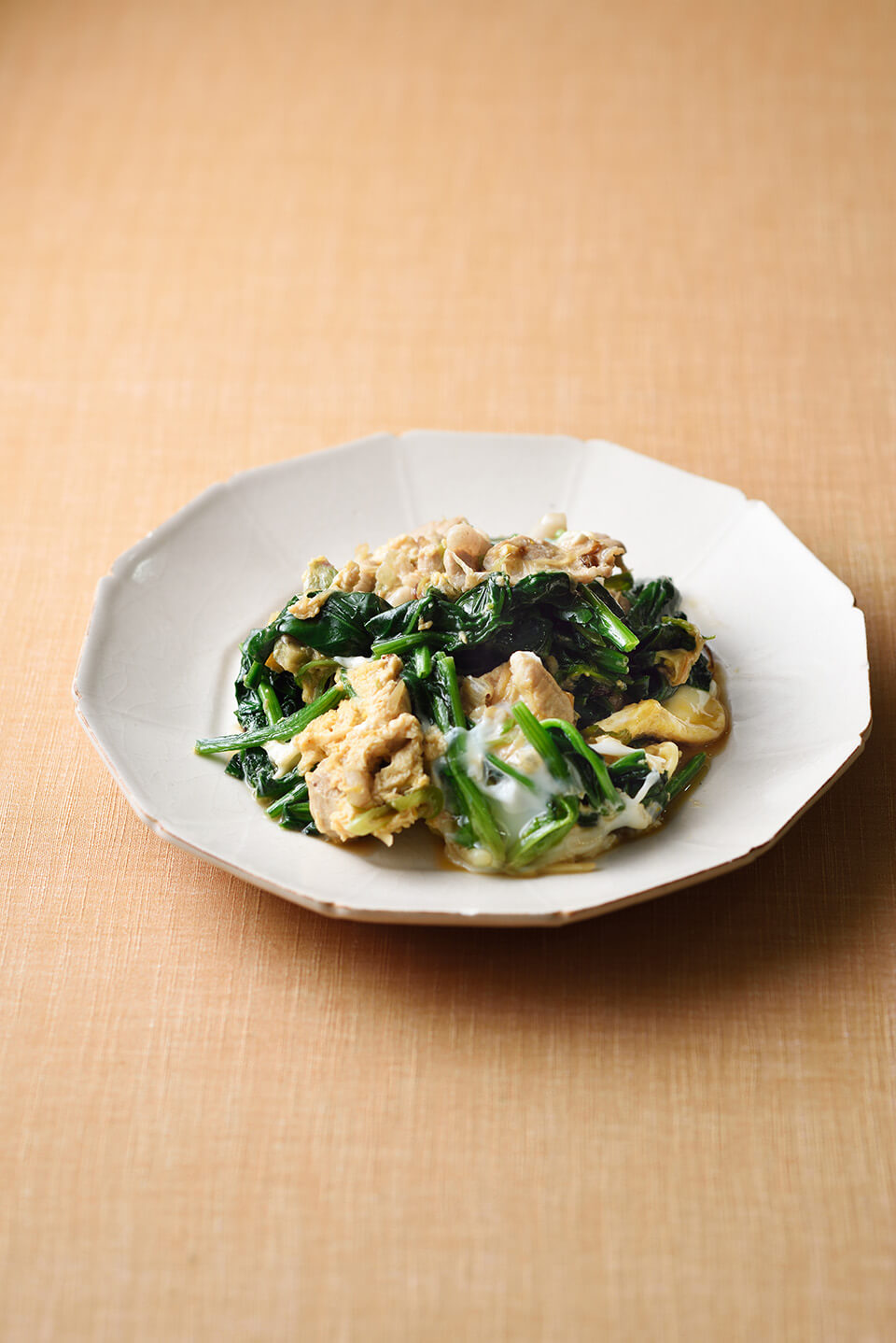 - フライパンにごま油を入れて熱し、ねぎ、しょうがを加えて炒める。香りが出たら、豚肉を加えて炒める。豚肉の色が変わったらほうれん草を戻し入れ、酒、しょうゆを加えてからめ、卵を溶いて回しいれる。半熟になったら盛り付ける。