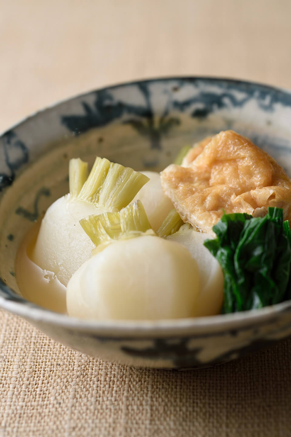 - 鍋にだし汁、みりん、薄口しょうゆを入れ、かぶと油揚げを加える。沸いたら、落としぶたをして弱火で15分煮る。かぶの葉をさっとゆで、水にとって3cm長さに切り、添える。