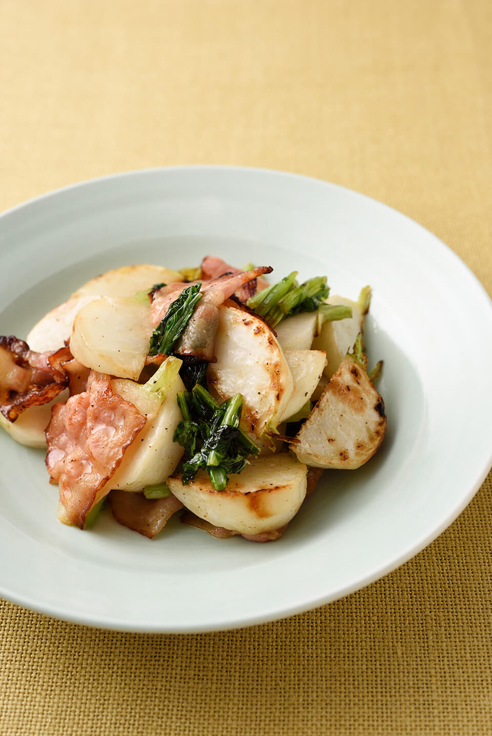 - フライパンにオリーブ油を熱してベーコンを入れ、炒める。脂が出てカリッとして来たら、かぶを加える。フライパンをゆすりながらかぶにこんがりと焦げ目がつくまで炒め、葉も加えて炒めて、仕上げに塩、こしょうで味をつける。