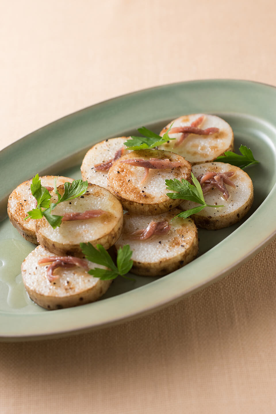 - フライパンにオリーブ油を入れて弱火にし、アンチョビーを入れる。香りが立ったら、長いもを入れて焼き付ける。両面に焦げ色がついて焼けてきたら塩、こしょうで味をつけ、イタリアンパセリを散らす。