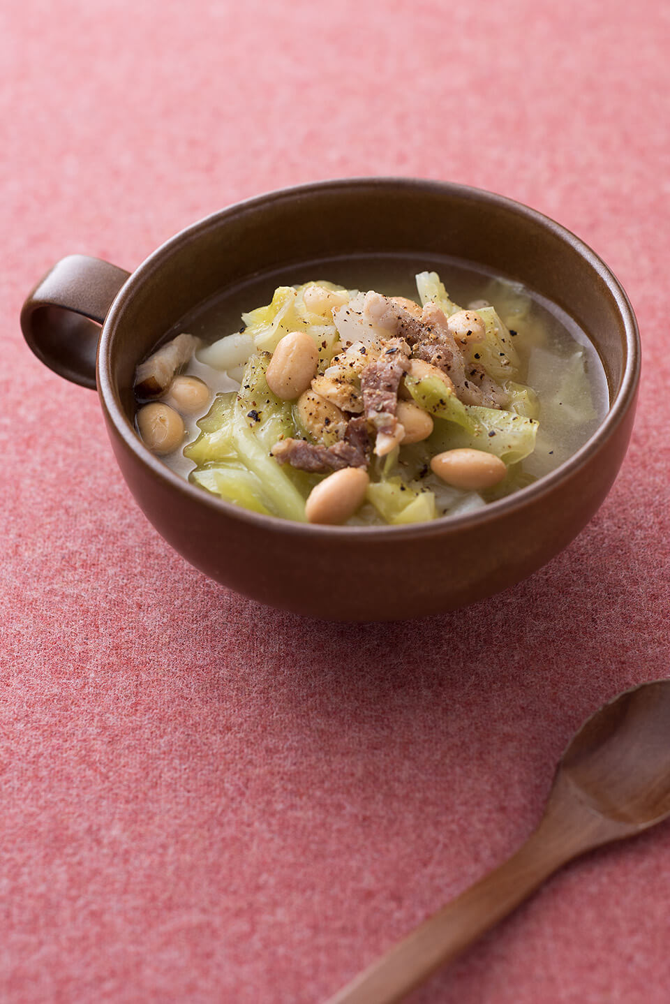 - 鍋にバターを入れて温め、ベーコンを加えて炒める。香りが出てきたら、キャベツを加える。しんなりしてきたら大豆を入れ、水400mlを加える。スープの素を加え、ふたをして中火で10分蒸し煮にする。塩、こしょうで味を調える。