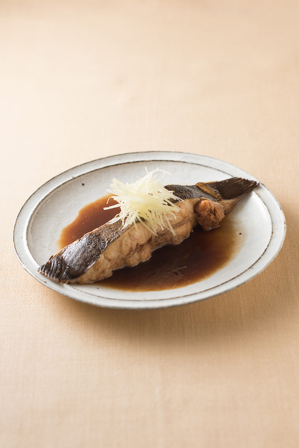 3. 火を止めて、粗熱が取れたら盛り付ける。煮汁だけを煮詰め、つやが出たら魚にかける。しょうがのせん切りを天盛りにする。