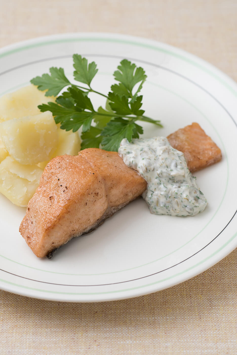 - 皿に盛り付け、マヨネーズソース、粉ふきいも、イタリアンパセリなどを添える。