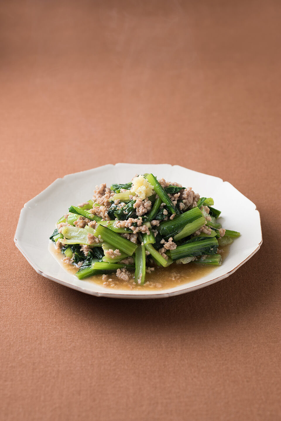 - 鍋にサラダ油を入れ、鶏ひき肉を加えよく炒める。色が変わったら、小松菜を入れてしんなりするまで炒め、だし汁、しょうゆ、砂糖、酒を加える。沸いたら強火で3〜4分にて水溶き片栗粉を加えて混ぜる。好みで七味とうがらしを入れても。
