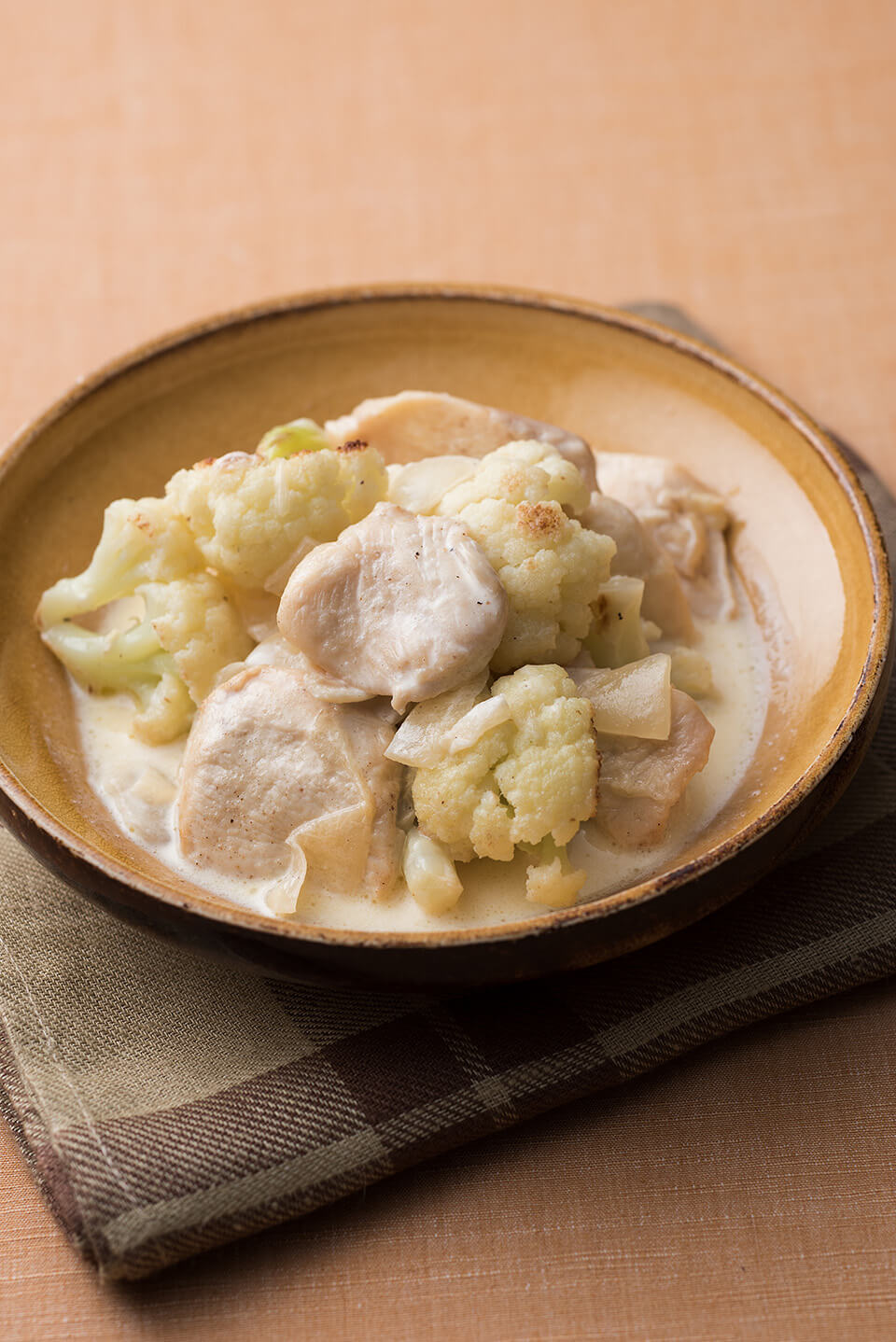 - 厚手の鍋にバターを入れてカリフラワーをソテーする。焦がさないようにしながら少し色がつくまでソテーし、玉ねぎを加えて炒める。さらに鶏肉を加えてさっと炒め、白ワインを加える。強火にしてふたをし、カリフラワーがほろっと崩れるくらいまで蒸し煮にする。