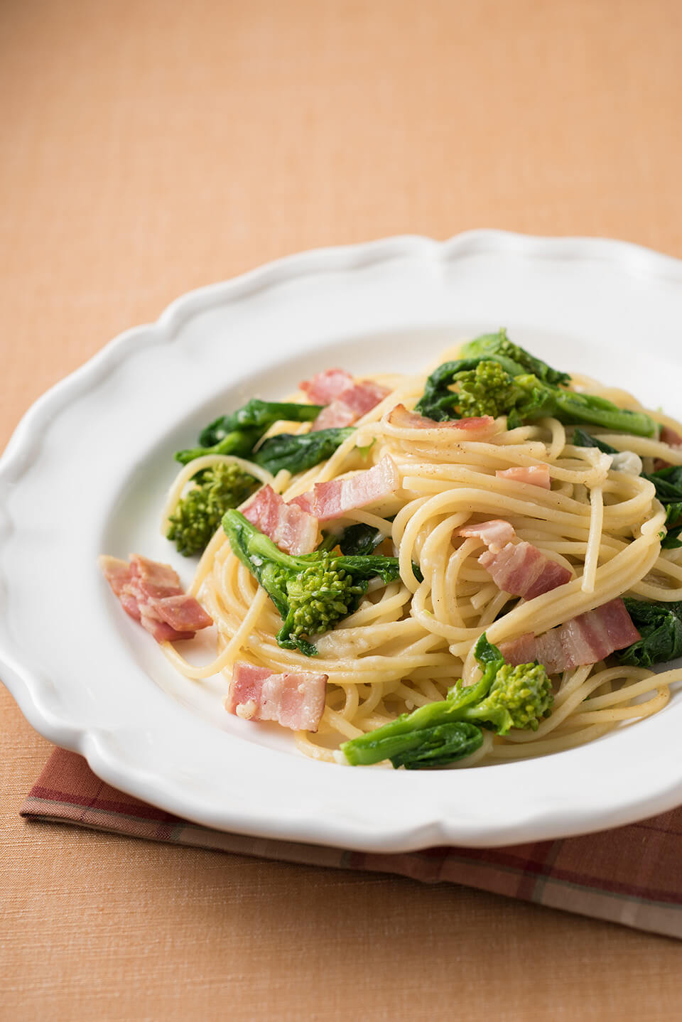 - 湯を1.5~2ℓ沸かし、沸騰したら塩(2ℓで30g)を加えてスパゲッティを入れ、袋の表示通りにゆでる。3分前になったら菜の花を加える。パスタと菜の花を取り出して湯をきり、フライパンに加える。ゆで汁大さじ1を加えてフライパンをゆすりながらからめる。味を見て、塩、こしょうをふる。仕上げに粉チーズをかける。