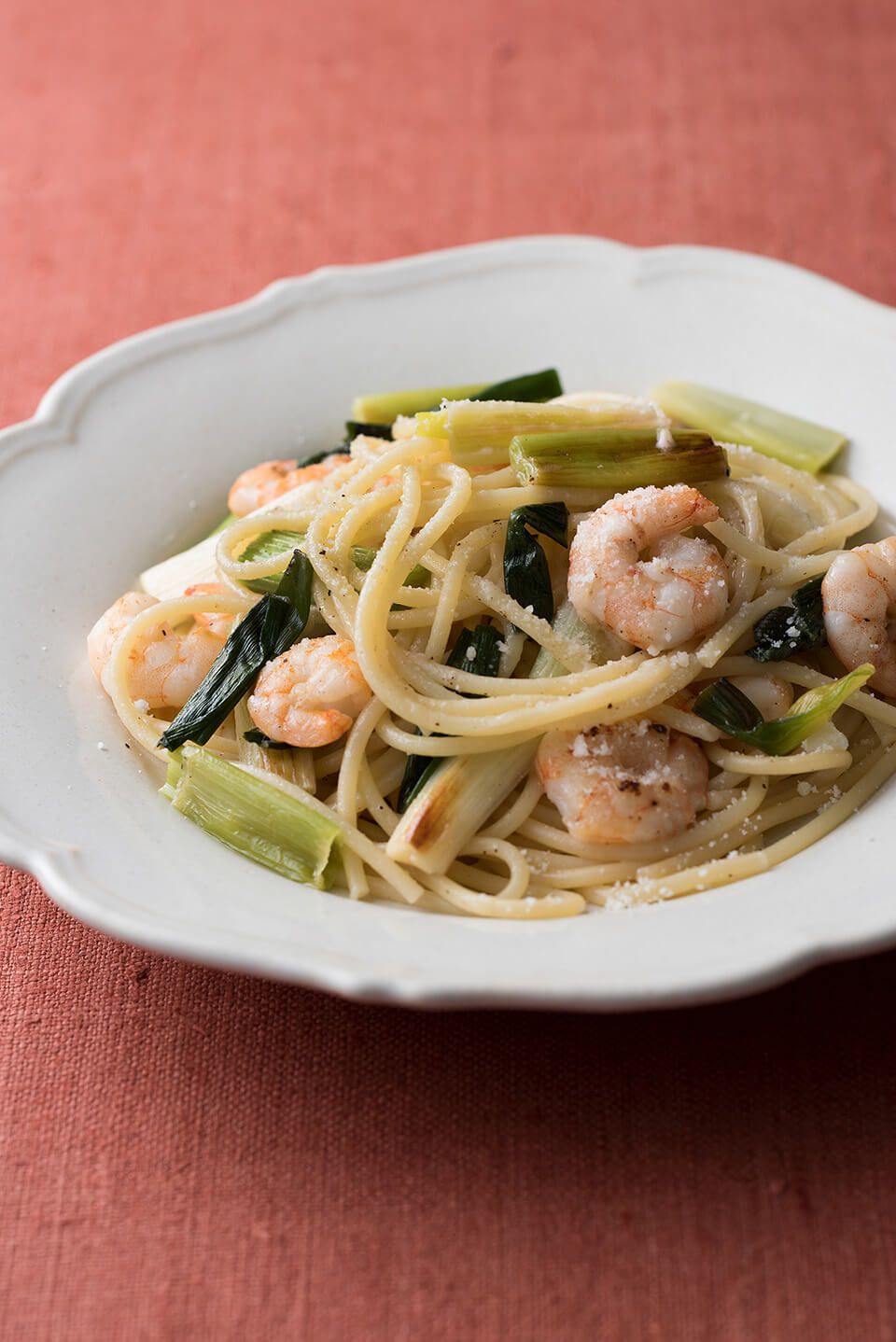 - フライパンにバターを入れて溶かし、わけぎを入れて中火で炒める、つやがよくなったらエビを加え、わけぎがしんなりするまで炒める。ゆであがったスパゲッティを加えてゆで汁を大さじ2ほど加え、強火でからめる。塩、こしょうで味を調え、粉チーズを加える。