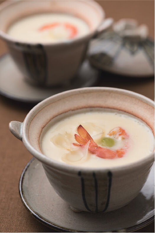 - 器に飾り用の具をとっておき、そのほかの具を入れて卵液を入れる。厚手の鍋に水を1cm深さに入れて、キッチンペーパーなどを敷いて器を入れる。ふたをずらして蒸す。沸騰したら弱火にして12分蒸す。