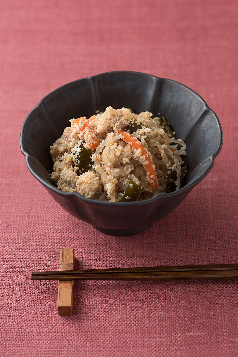 - にんじんはせん切りに、しょうがもせん切りにする。しらたきは水からゆで、ざるに上げて食べやすく切る。