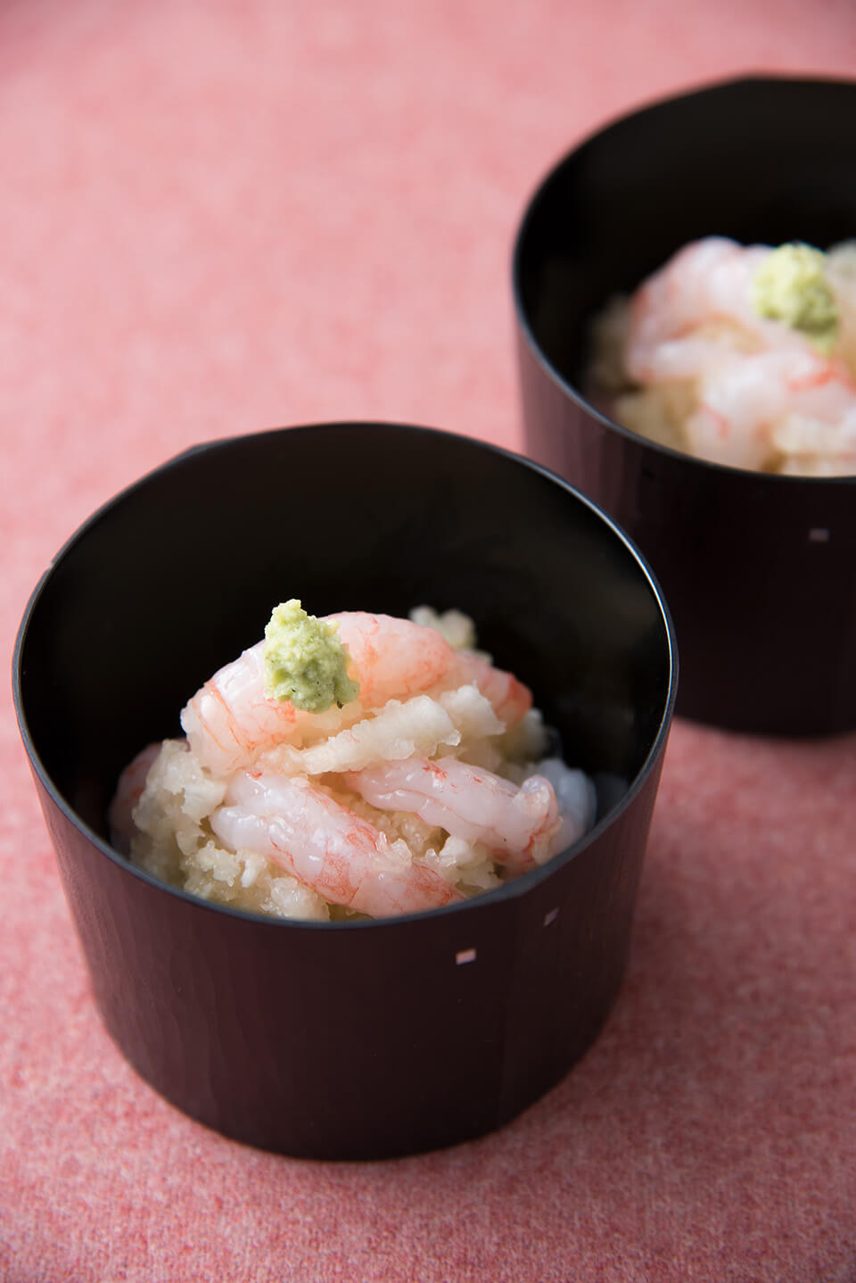 - 甘エビをあえて盛り付け、二杯酢をかける。好みでわさびなどを添えも。