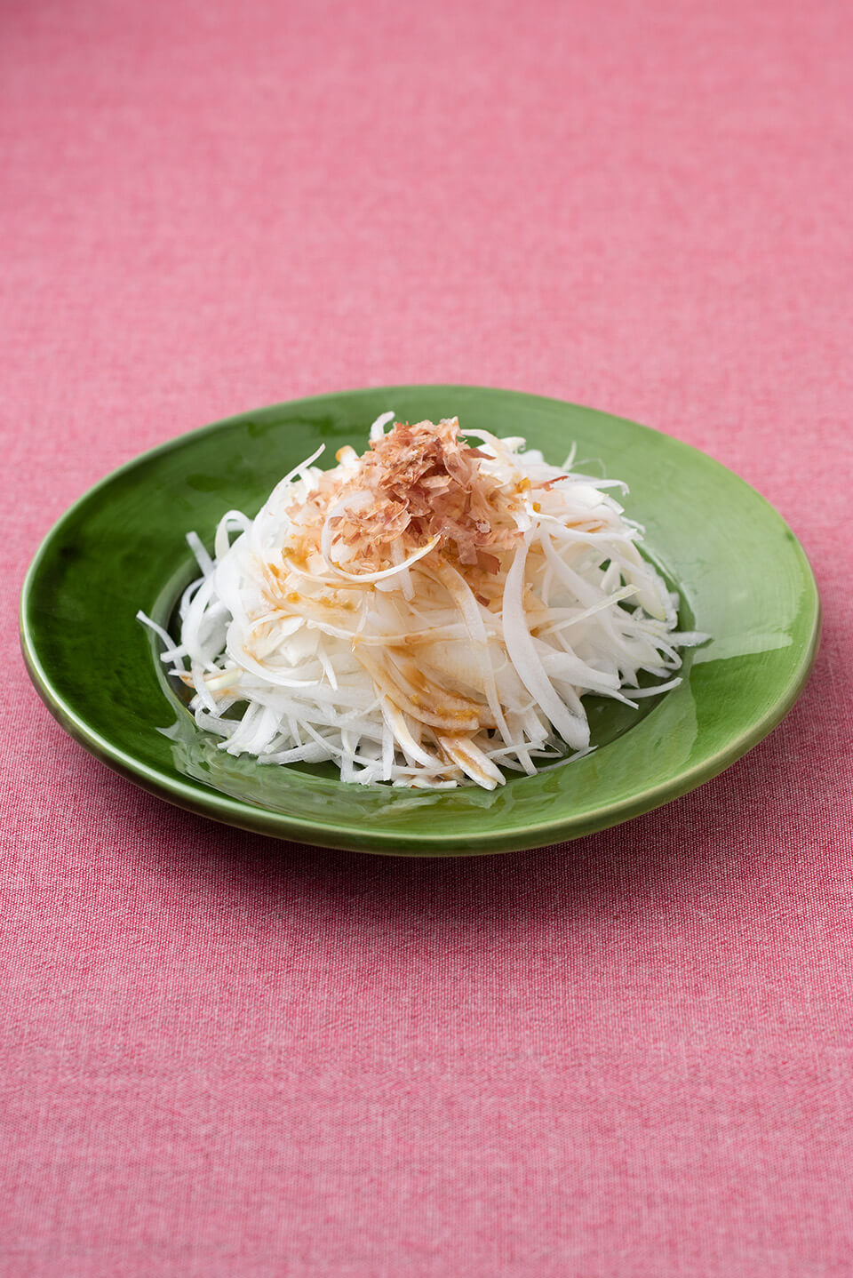 1. 新玉ねぎは芯を取って繊維に沿って薄切りにする。水に3分ほどさらし、よく水けをきる。