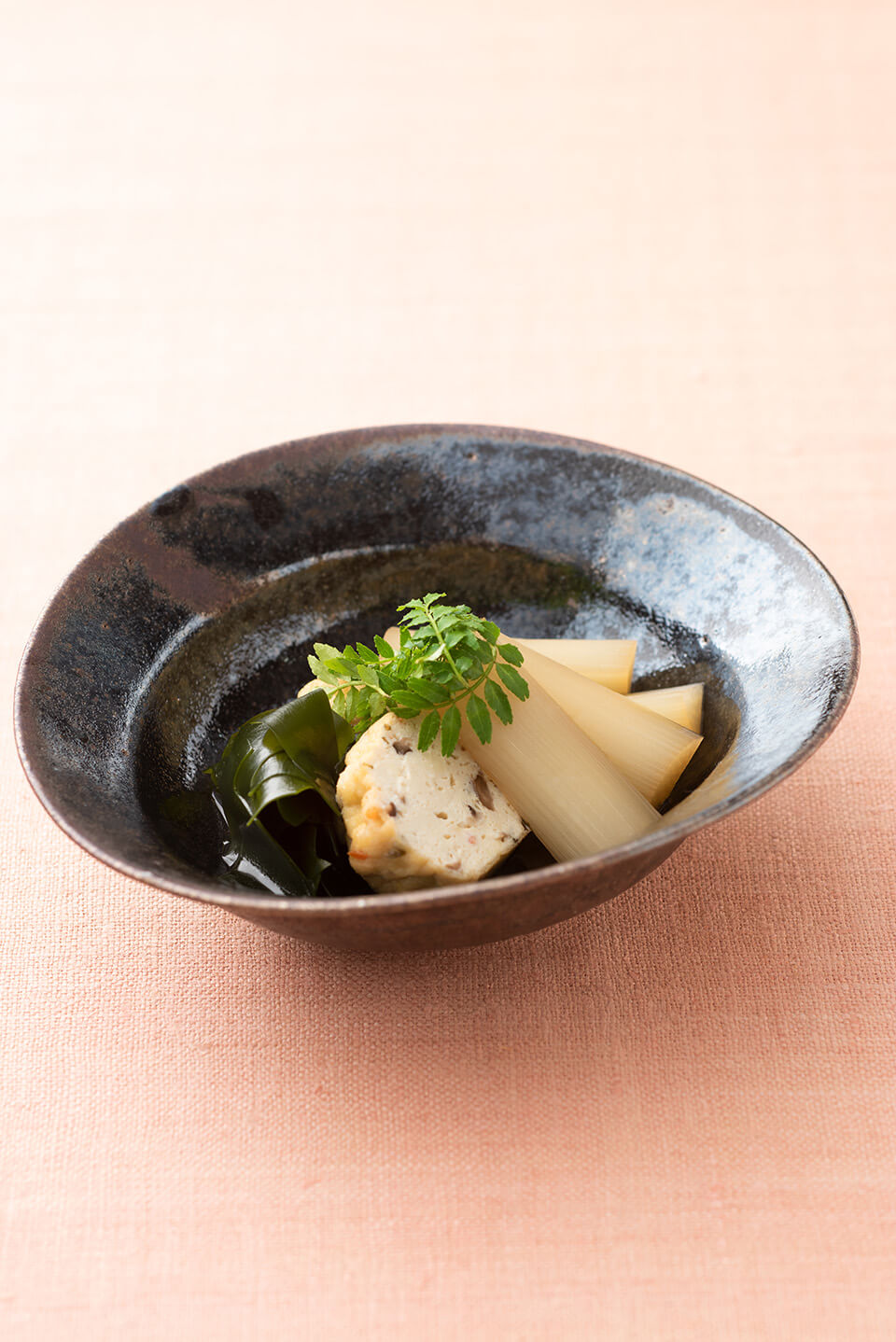 3. 鍋にだし汁、みりん、塩、薄口しょうゆを加え、半分に切ったミニがんもどきを入れて、落としぶたをして弱めの中火で5分煮る。うどと塩蔵わかめを加えてさらに5分煮、盛り付ける。