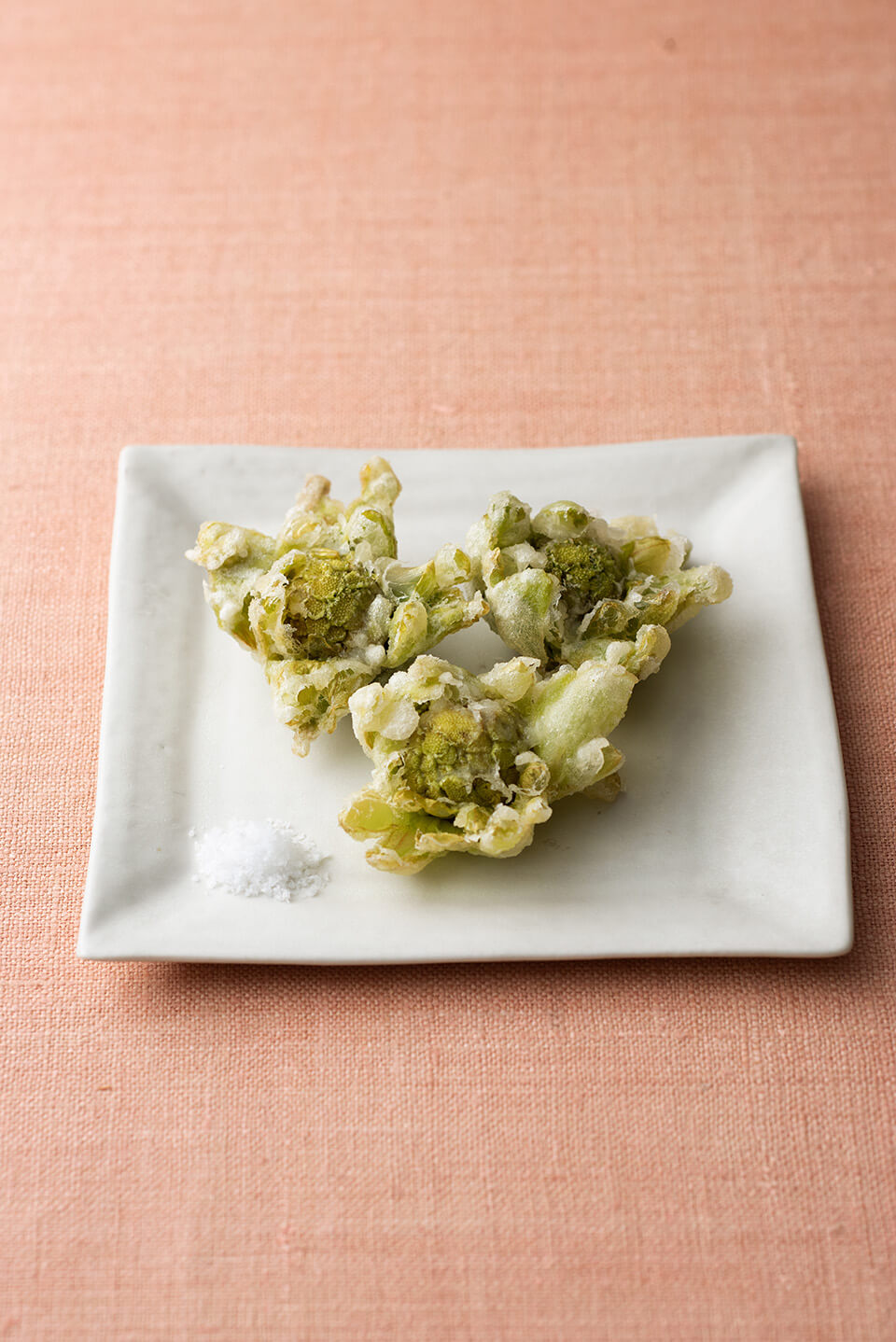 - ボウルに小麦粉と水を混ぜる。たっぷりところもをつけ、つぼみのところを指でこそげてころもをはがす。白いころもが薄く付き、雪に見えるように揚げる。