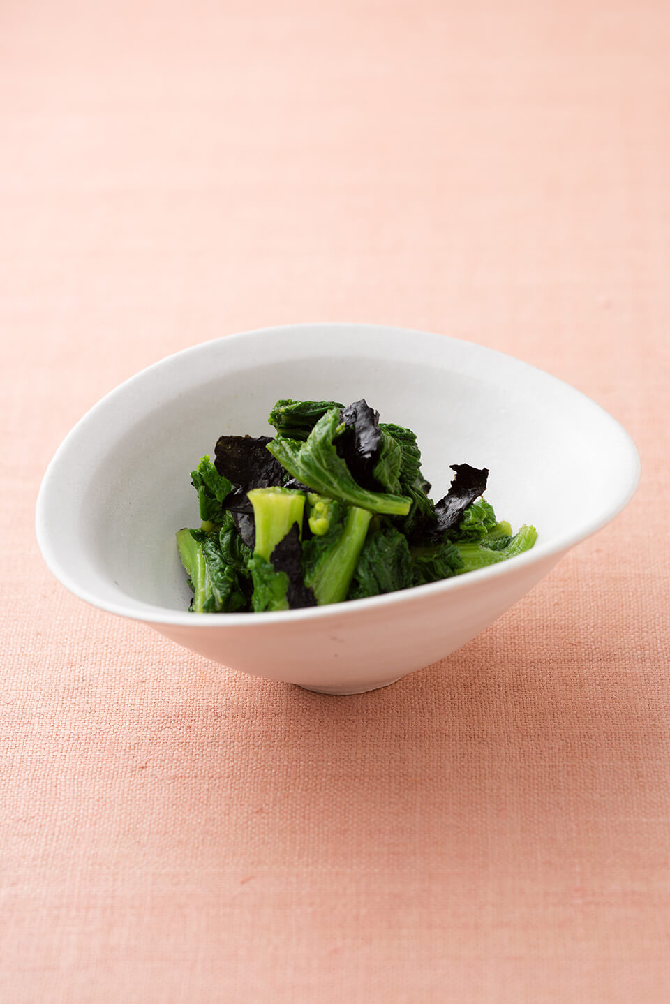 - ボウルに、しょうゆ、溶きがらし、だし汁を加え、菜の花を入れてあえる。まんべんなくあえたら、ちぎった焼き海苔を散らす。