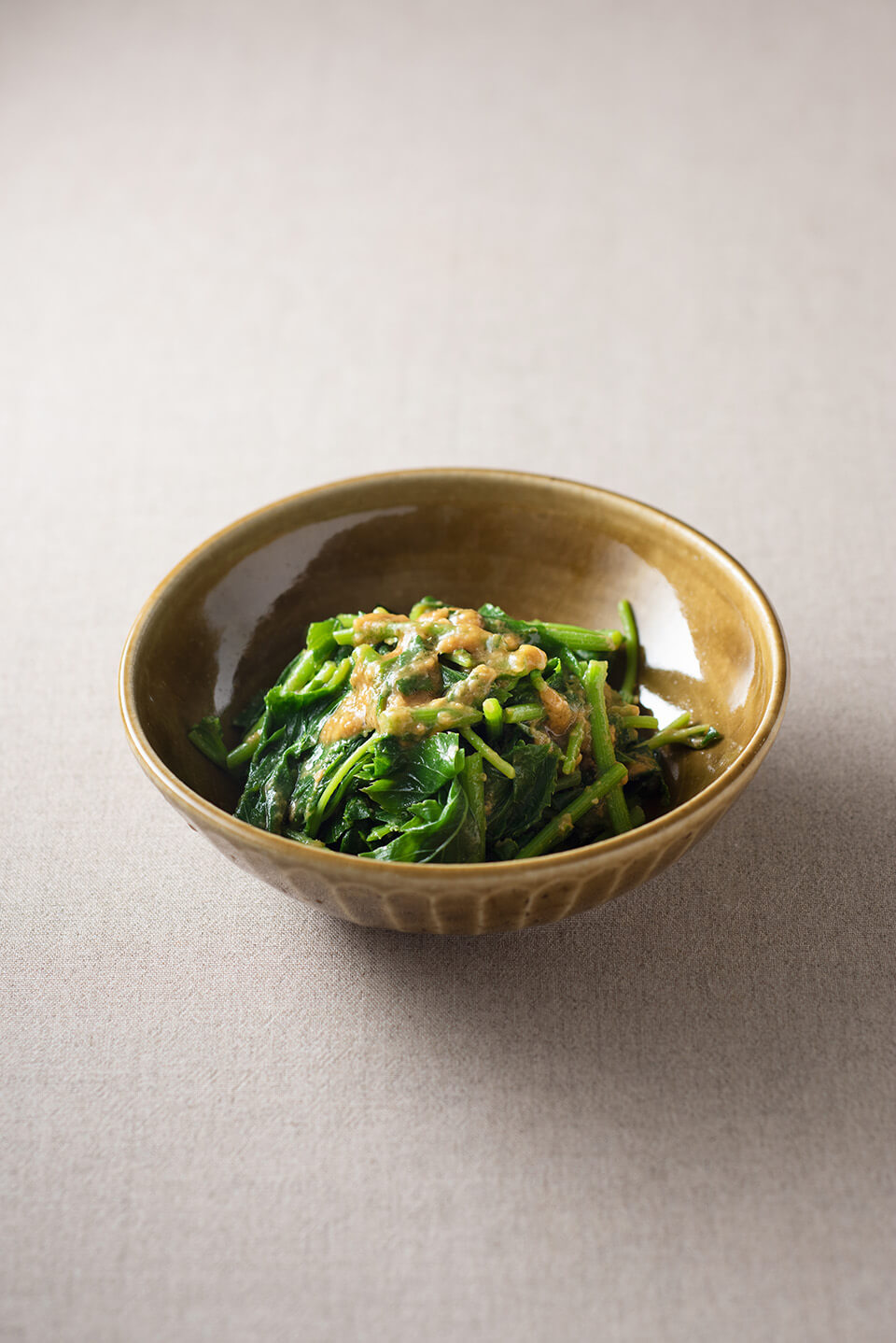 - ボウルに練りがらし、白味噌、しょうゆ、砂糖、酢、サラダ油を混ぜ、明日葉をあえる。