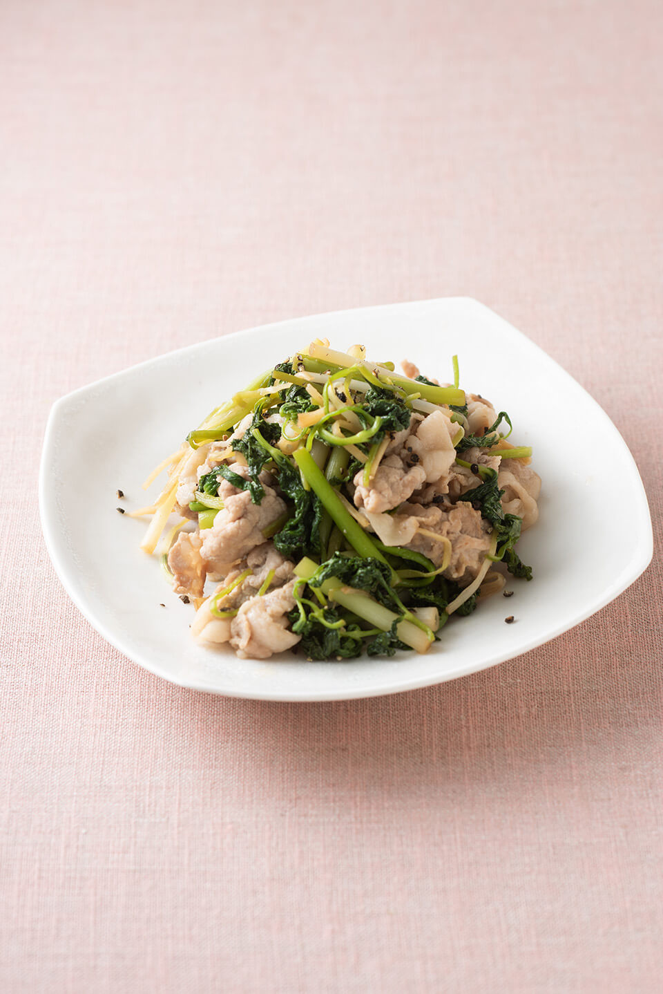 - 三つ葉を加えて強火でさっと炒め、酒、しょうゆで味を調える。
