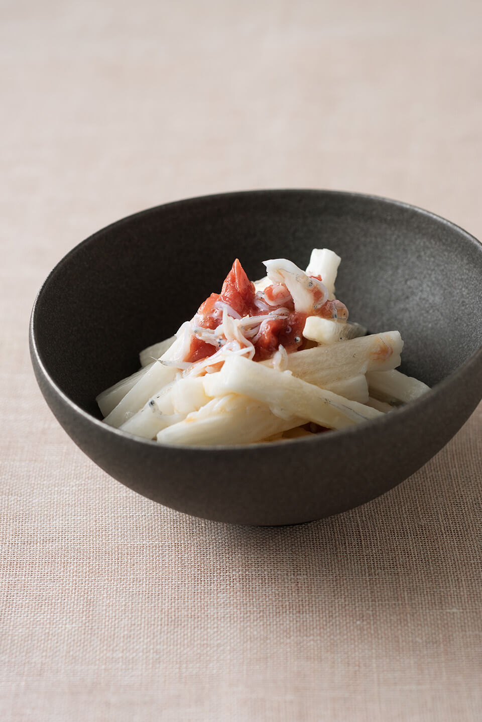 2. 器に、長いもを盛り付け、種を取った梅干し、シラスを散らし、二杯酢の材料を合わせてかける。