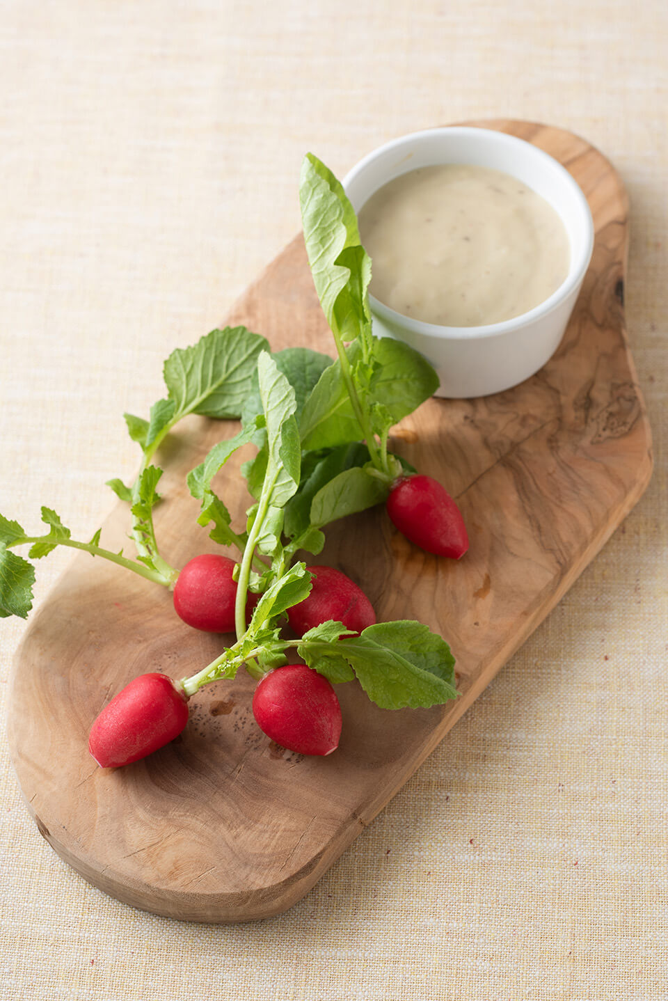 - ラディッシュはよく洗い、根の先や汚れた部分を除いて添える。