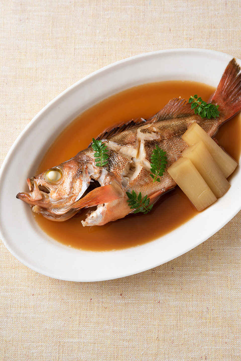 - 皿にメバル、うどを取り出す。みりんを加え煮汁を煮詰め、つやが出てきたら火を止めてメバルにかける。木の芽をのせる。