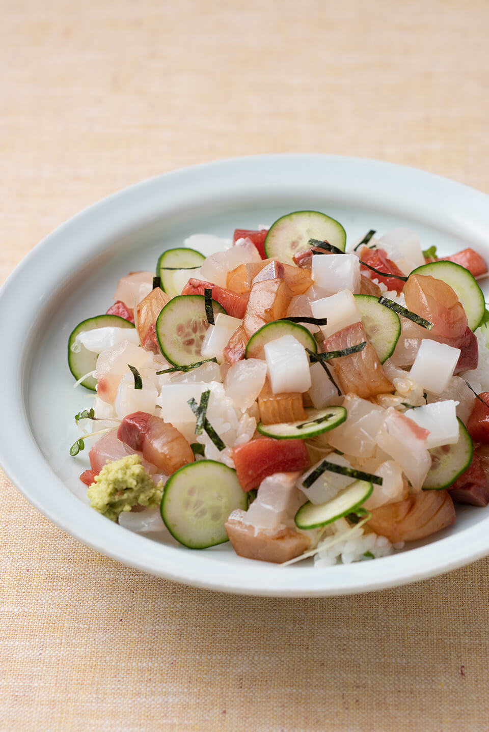 - 刺身はそれぞれ1cm角に切る。わさびしょうゆにからめておく。貝割れ菜は根元を切り、きゅうりは薄切りにする。