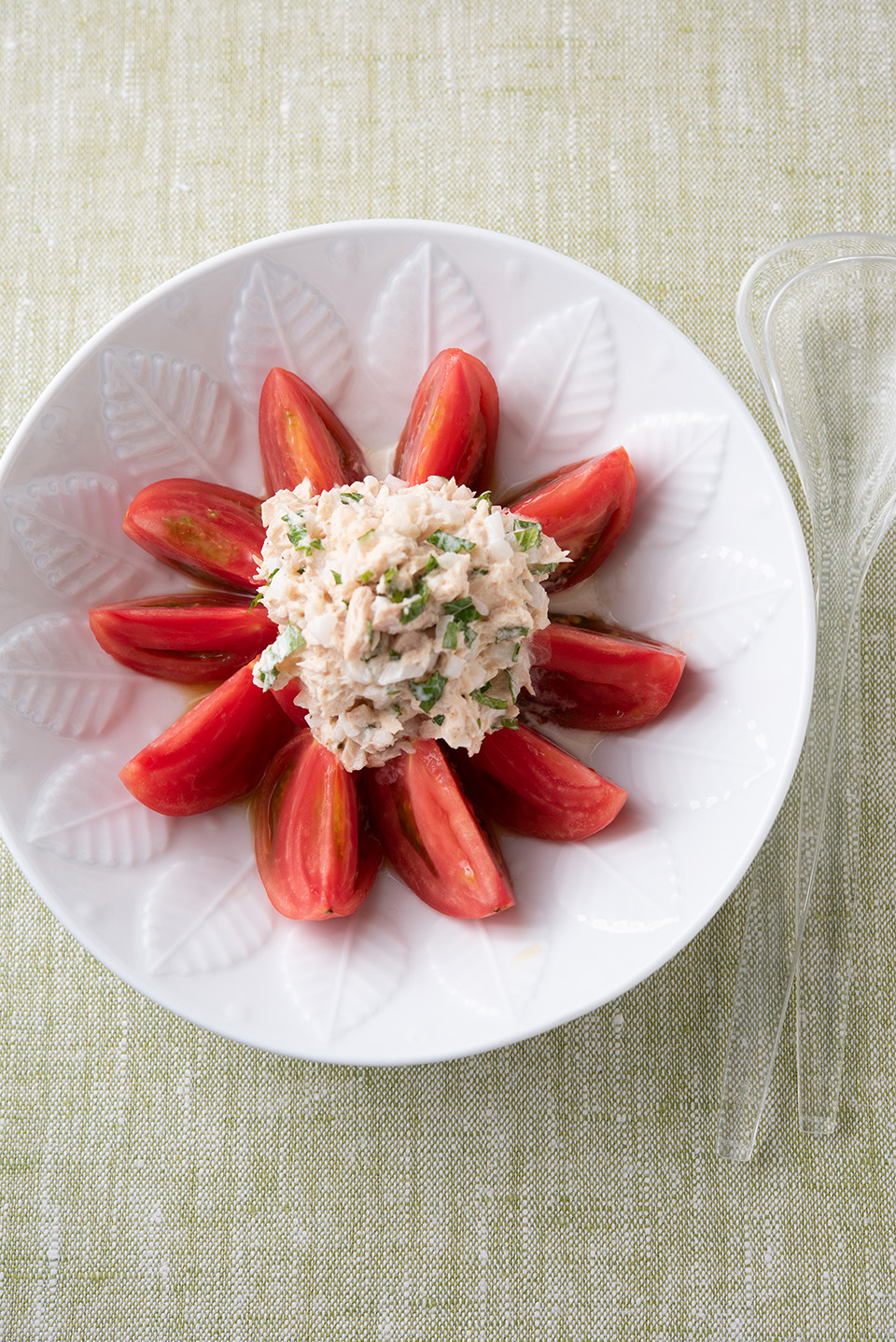 - ③の器に冷やしたトマトを盛り、②のツナソースをのせる。