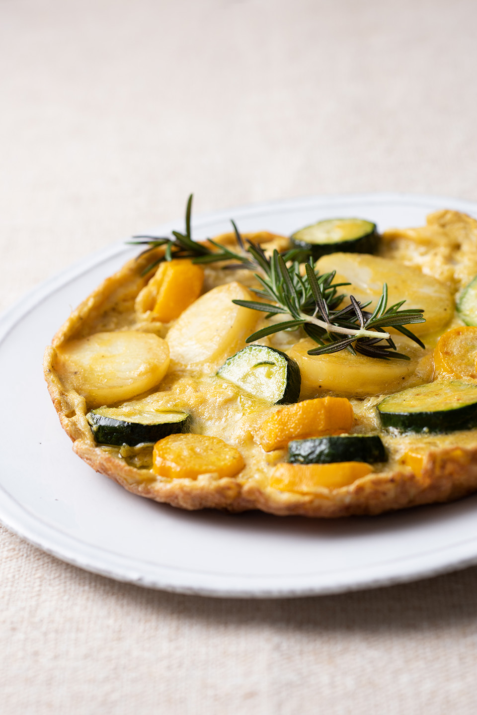 - フライパンのじゃがいもとズッキーニがやわらかくなったら、卵液を大きく回し入れる。フライパンをゆすり大きく混ぜ、弱火でふたをして好みの焼き加減に焼く。