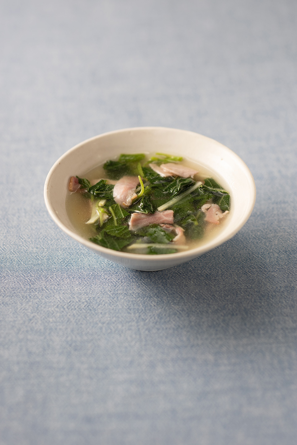 - 鍋にごま油を入れて、モロヘイヤを炒める。しんなりしたらハムを加える。中華スープを加え、沸いたら塩、こしょう、しょうゆ少々で味をつける。
