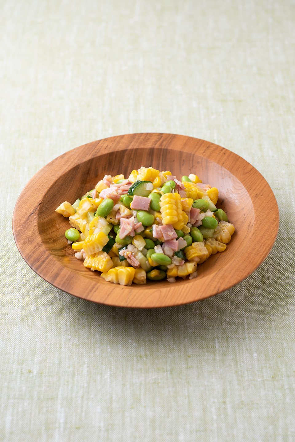 - とうもろこしは、水から塩を入れて5分ゆで、ざるにあげて実をこそげる。枝豆はさやごと塩でもみ、うぶ毛を取って水から塩をまぶしたままゆでる。5分ゆでてざるに上げ、さやから豆を出す。