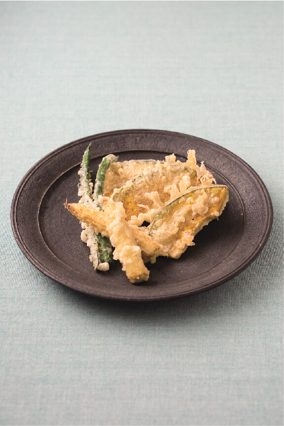 - 野菜をころもにくぐらせ、揚げ油に入れてこんがりと揚げる。好みで塩をつけて