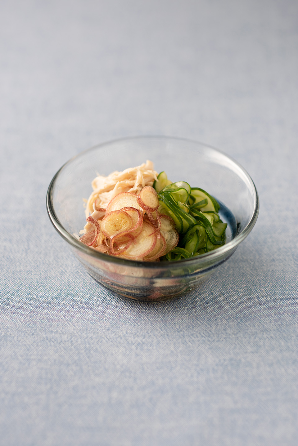 - 水分を絞ったきゅうりに二杯酢大さじ1をかけ、下味をつける。鶏ささ身、みょうがも残りの二杯酢であえて盛り付ける。