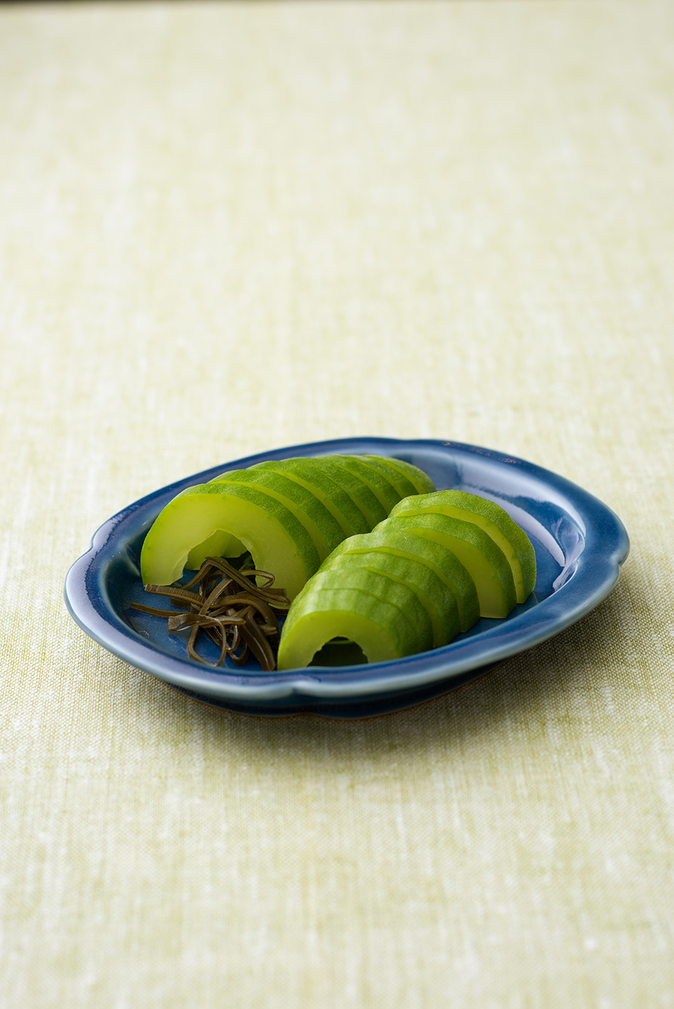 - 白うりは縦半分に切る。種をスプーンで取って皮に塩をまぶし、よくもんでおく。さっと洗ってビニールに入れる。だし昆布、塩、しょうゆを加え、水50mlを加えて空気を抜いて結ぶ。そのままバットなどに重しを置いてのせ、冷蔵庫で3時間以上漬ける。
