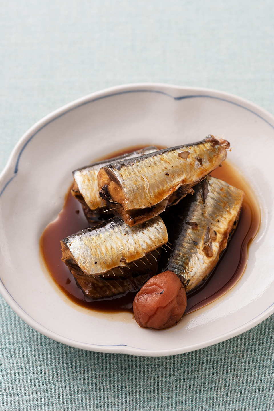 - 鍋に水、酢、砂糖、しょうゆ、酒を入れて沸かし、イワシと梅干を並べ入れる。煮汁を回しかけて落しぶたをし、弱めの中火で煮汁が少なくなるまで、20分ほど煮る。