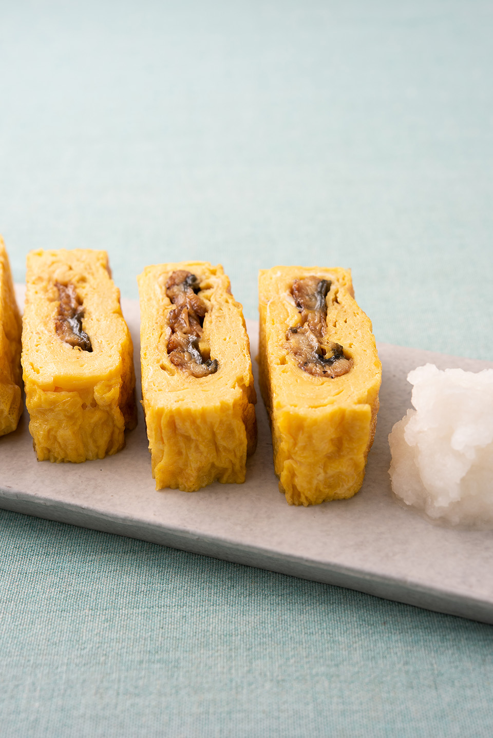 - 巻き終わったら卵を向こうに押しやり、③の油球でサラダ油を塗ってなじませる。③と同じように卵焼き器の温度を確認したら、残りの半量の卵液を流し、焼いた卵の下にも流し入れる。最初と同様に焼いて、同じ手順をもう一度繰り返す。