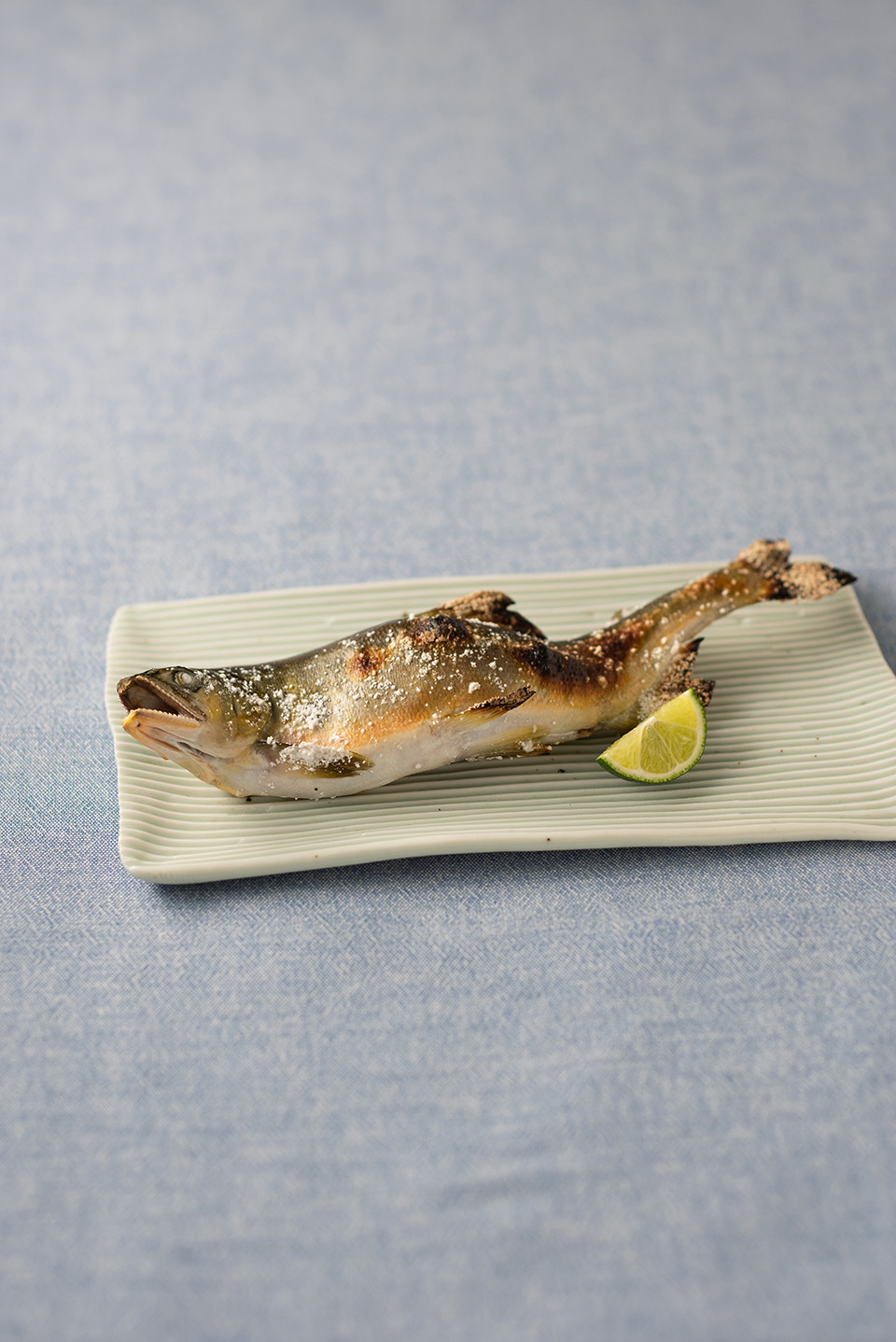 1. 鮎はさっと水洗いしてよく水けをふき取る。裏から波打つように串を打つ。(串を打ってあるものを買ってよい)、ひれと尾に多めの塩をふる。全体にふり塩をして、グリルで焼く。