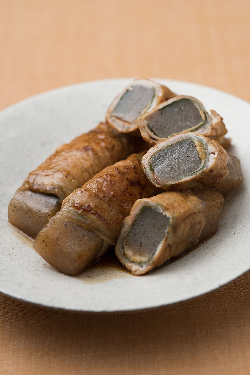 - 豚肉を広げ、青じそをのせて味噌だれを小さじ1のせ、こんにゃくをのせてくるりと巻く。